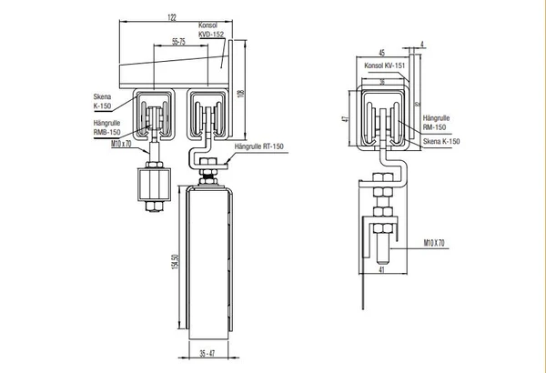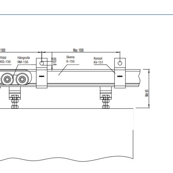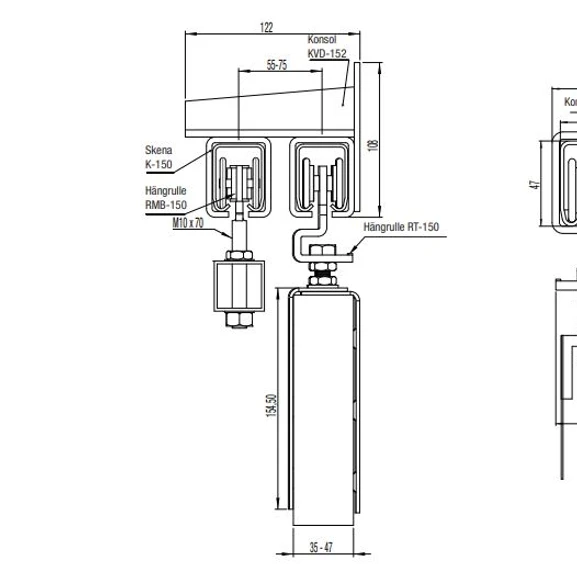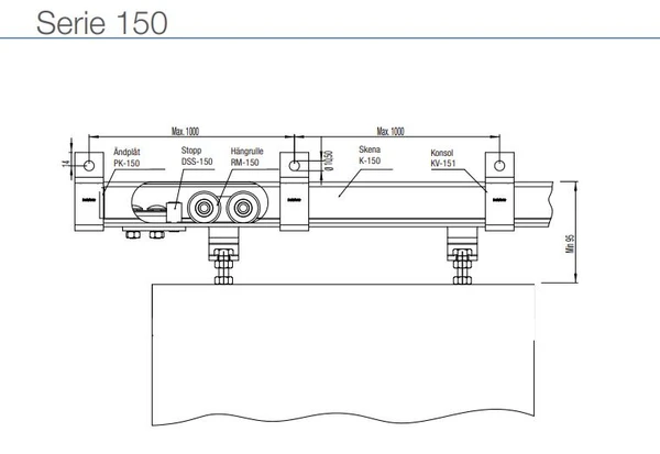 Avsedd för skjutportar och skjutbara väggpartier med vikt upp till 150-200 kg, beroende på monterings plats. Serie 150 är också lämplig för industridraperier samt för olika typer av transportändamål. Hängrullarna har engångssmorda kullager.
